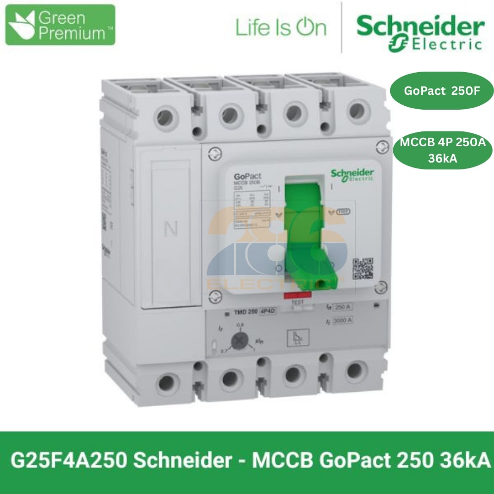 G25F4A250 Schneider là aptomat MCCB 4 cực (4P) thuộc dòng GoPact MCCB 250 của Schneider Electric – thương hiệu hàng đầu về thiết bị điện. Với dòng định mức 250A và khả năng cắt ngắn mạch lên đến 36kA tại 415VAC, thiết bị này là lựa chọn hàng đầu để bảo vệ hệ thống điện công nghiệp, tòa nhà và các công trình điện yêu cầu độ an toàn cao.Trong bài viết này, cùng Thiết bị điện 286 tìm hiểu về dòng Gopact MCCB 250 Schneider G25F4A250 này nhé!
