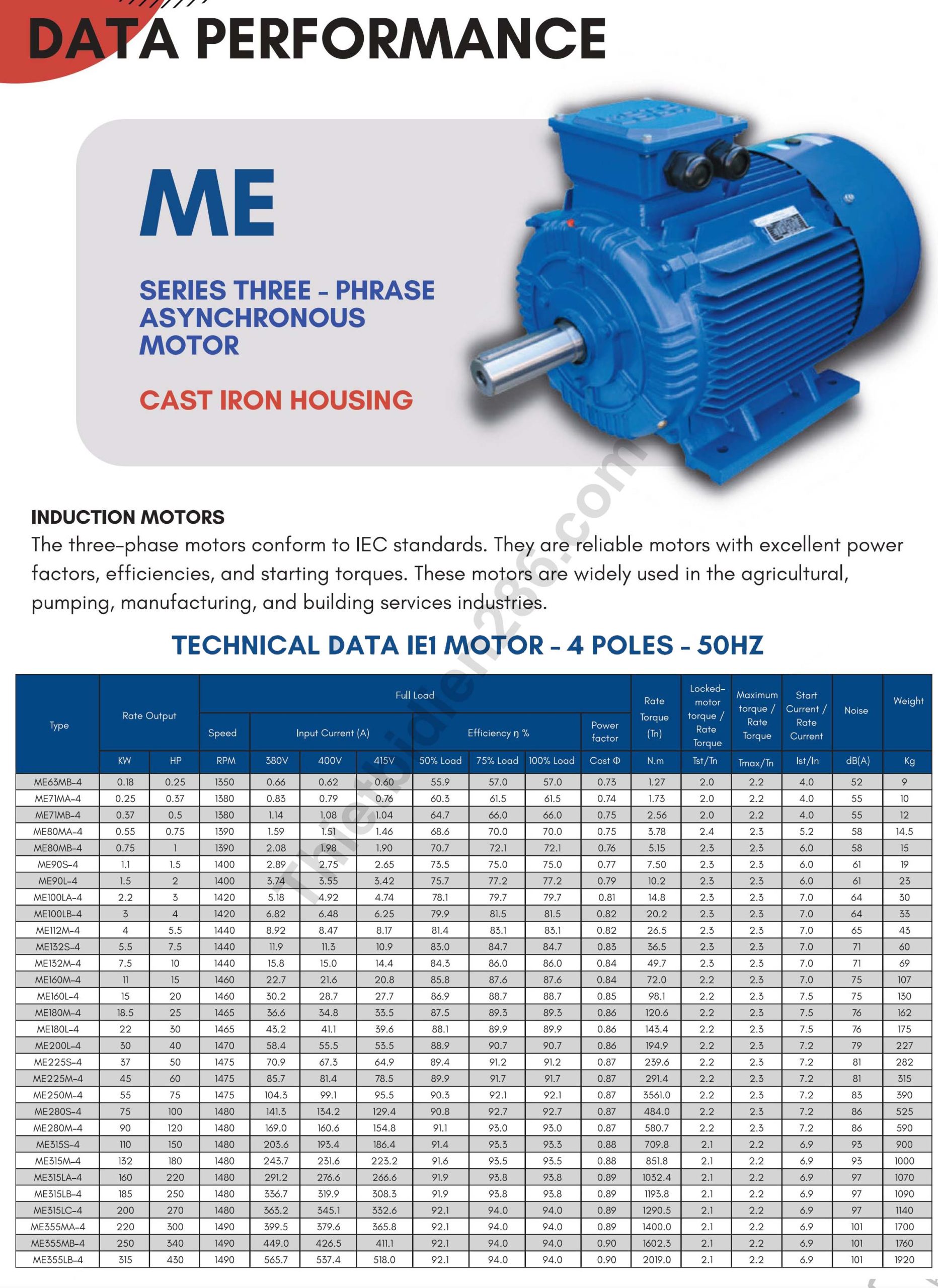 ME100L-4, ME132SA-4, ME160L-4 | Dùng cho các ứng dụng công nghiệp trong các dây chuyền sản xuất, máy nén khí công nghiệp, máy bơm lớn và hệ thống quạt công nghiệp. |
