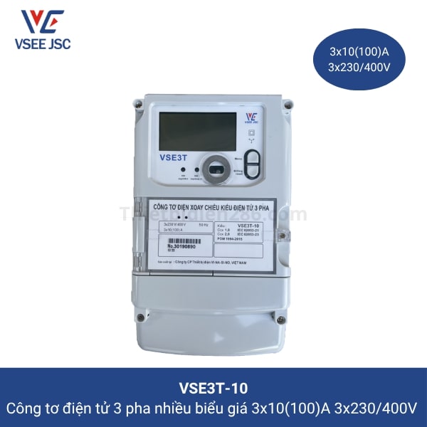 Công tơ điện tử 3 pha nhiều biểu giá, trực tiếp VSE3T-10 Vinasino là công tơ điện dùng để đo đếm điện năng hữu công (kWh) và vô công (kvarh) ở lưới điện xoay chiều 3 pha. Công tơ điện tử được thiết kế và sản xuất theo tiêu chuẩn quốc tế IEC và tiêu chuẩn Việt Nam.