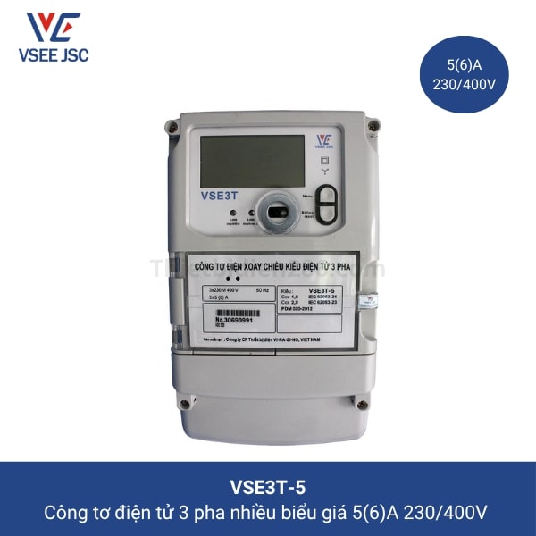 Công tơ điện tử 3 pha nhiều biểu giá, gián tiếp VSE3T-5 Vinasino là công tơ dùng để đo đếm điện năng hữu công (kWh) và vô công (kvarh) ở lưới điện xoay chiều 3 pha. Công tơ điện tử được thiết kế và sản xuất theo tiêu chuẩn quốc tế IEC và tiêu chuẩn Việt Nam.