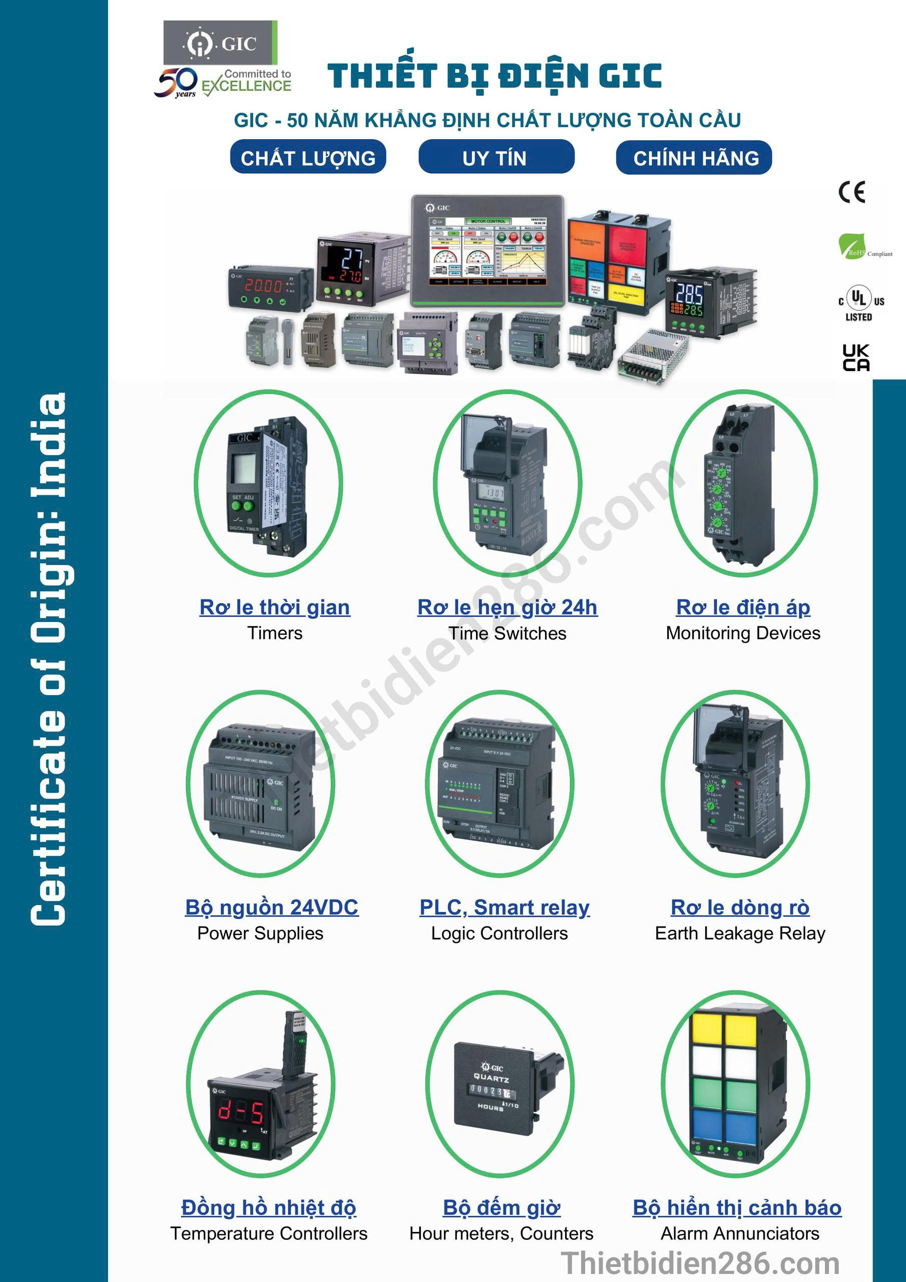 GIC India là thương hiệu thiết bị điện công nghiệp hàng đầu đến từ Ấn Độ, với hơn 50 năm phát triển và khẳng định chất lượng toàn cầu. Tại Việt Nam, Thiết bị điện 286 tự hào là đơn vị phân phối chính hãng nhiều dòng sản phẩm của GIC, từ rơ le thời gian, bộ đếm giờ, bộ nguồn 24VDC đến PLC, bộ điều khiển nhiệt độ và nhiều thiết bị giám sát khác.